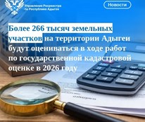 В 2026 году на территории Республики Адыгея пройдет очередная массовая государственная кадастровая оценка земельных участков, учтенных в Едином государственном реестре недвижимости по состоянию на 01.01.2026. Согласно сведений Единого государственного реестра недвижимости необходимо актуализировать кадастровую стоимость более чем 266 тысяч земельных участков.