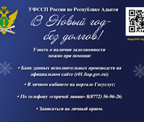В преддверии новогодних праздников в Управлении Федеральной службы судебных приставов России по Республике Адыгея стартует ставшая уже традиционной акция «В Новый год без долгов!», c целью напомнить жителям региона о необходимости своевременного погашения задолженностей.