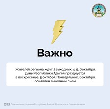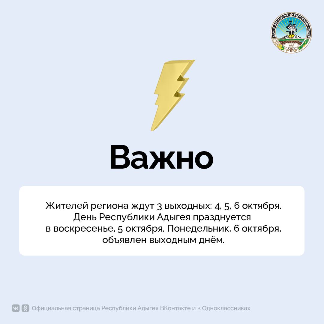 По распоряжению Главы Адыгеи в 2025 году жителей республики ждут три выходных дня подряд — с 4 по 6 октября.