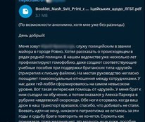 «Хотел рассказать о происходящем в рядах родной полиции. В нашем ведомстве уже несколько лет профилактируют гомофобию, даже создают соответствующие учебные пособия при поддержке британских типа «друзей» (прикрепил к письму файлом)», — пишет полицейский.