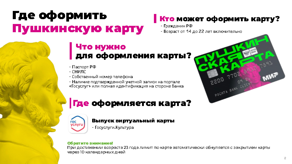 Сделать Пушкинскую карту в 2025 году можно через портал Госуслуги: