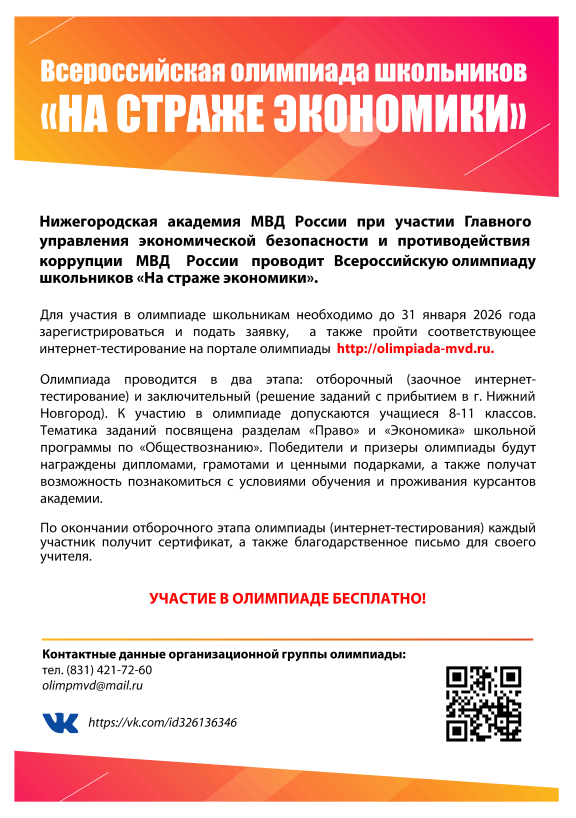Нижегородская академия МВД России объявляет о начале отборочного этапа ежегодной Всероссийской олимпиады школьников «На страже экономики». Заочный этап олимпиады 2025-2026 учебного года проводится с 11 ноября 2025 года по 31 января 2026 года.