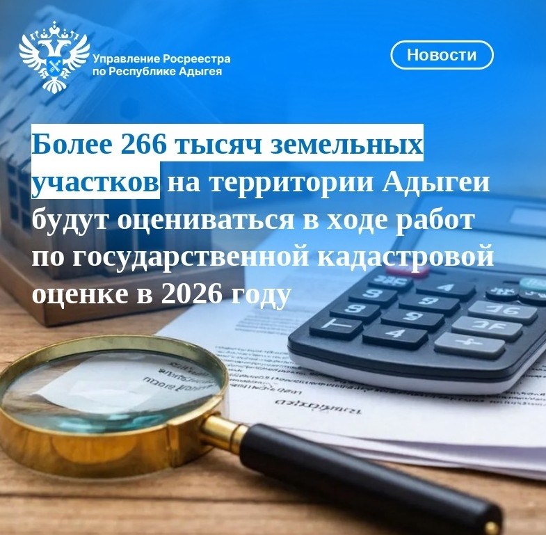 В 2026 году на территории Республики Адыгея пройдет очередная массовая государственная кадастровая оценка земельных участков, учтенных в Едином государственном реестре недвижимости по состоянию на 01.01.2026. Согласно сведений Единого государственного реестра недвижимости необходимо актуализировать кадастровую стоимость более чем 266 тысяч земельных участков.